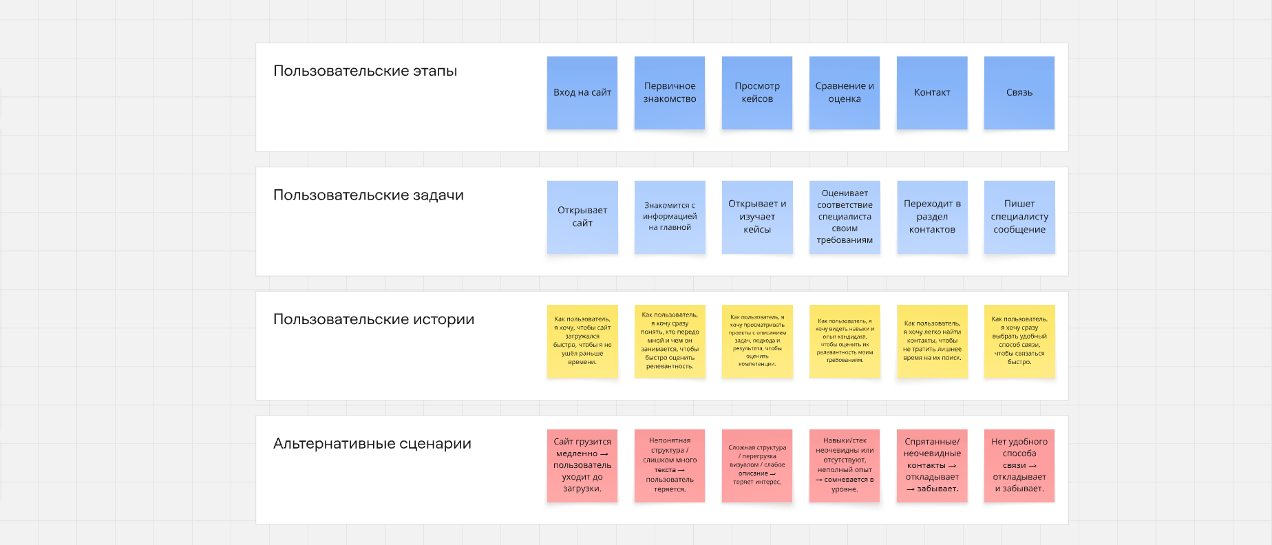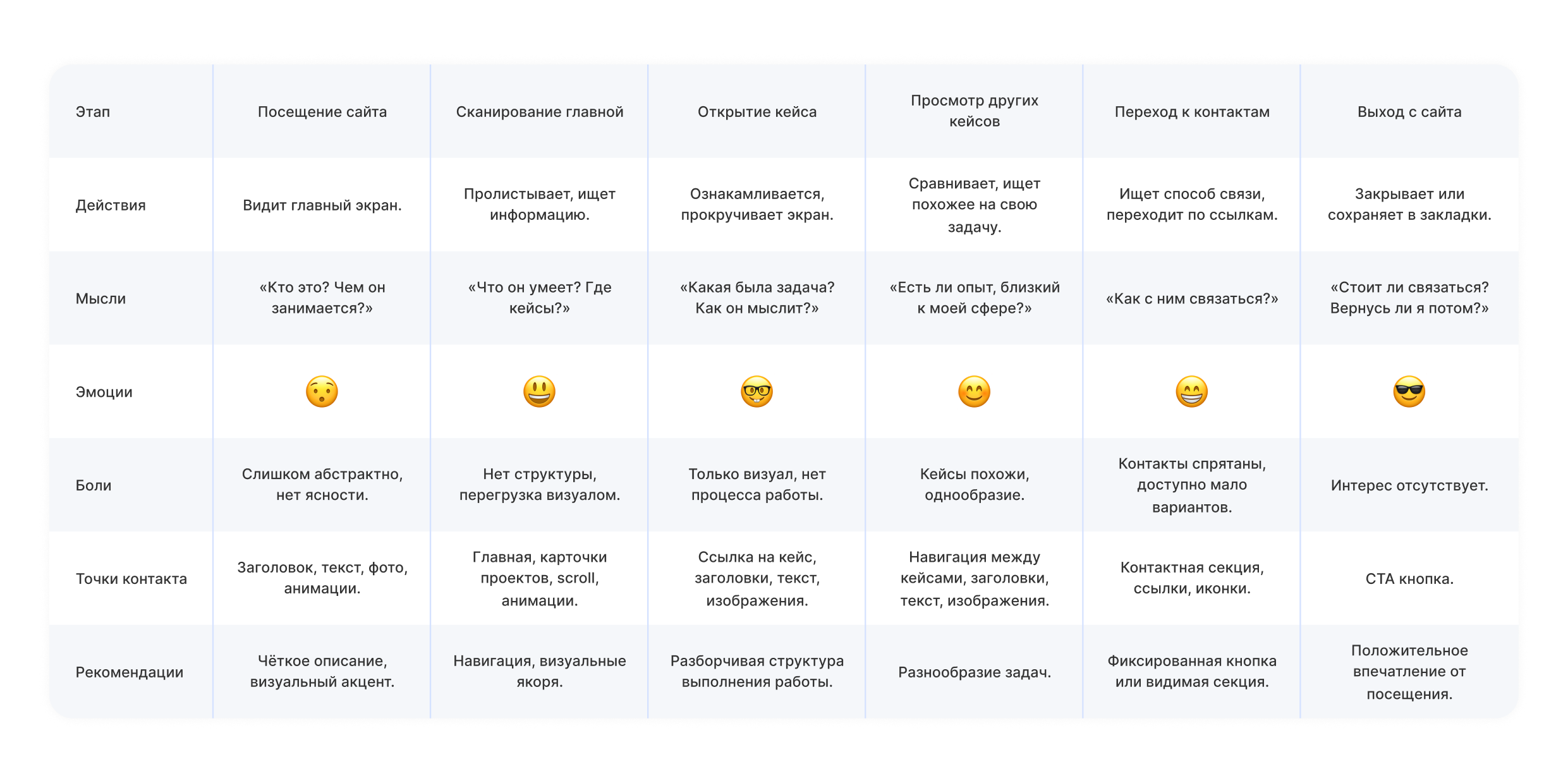 Я собрал всё в Customer Journey Map, чтобы увидеть путь глазами посетителя.