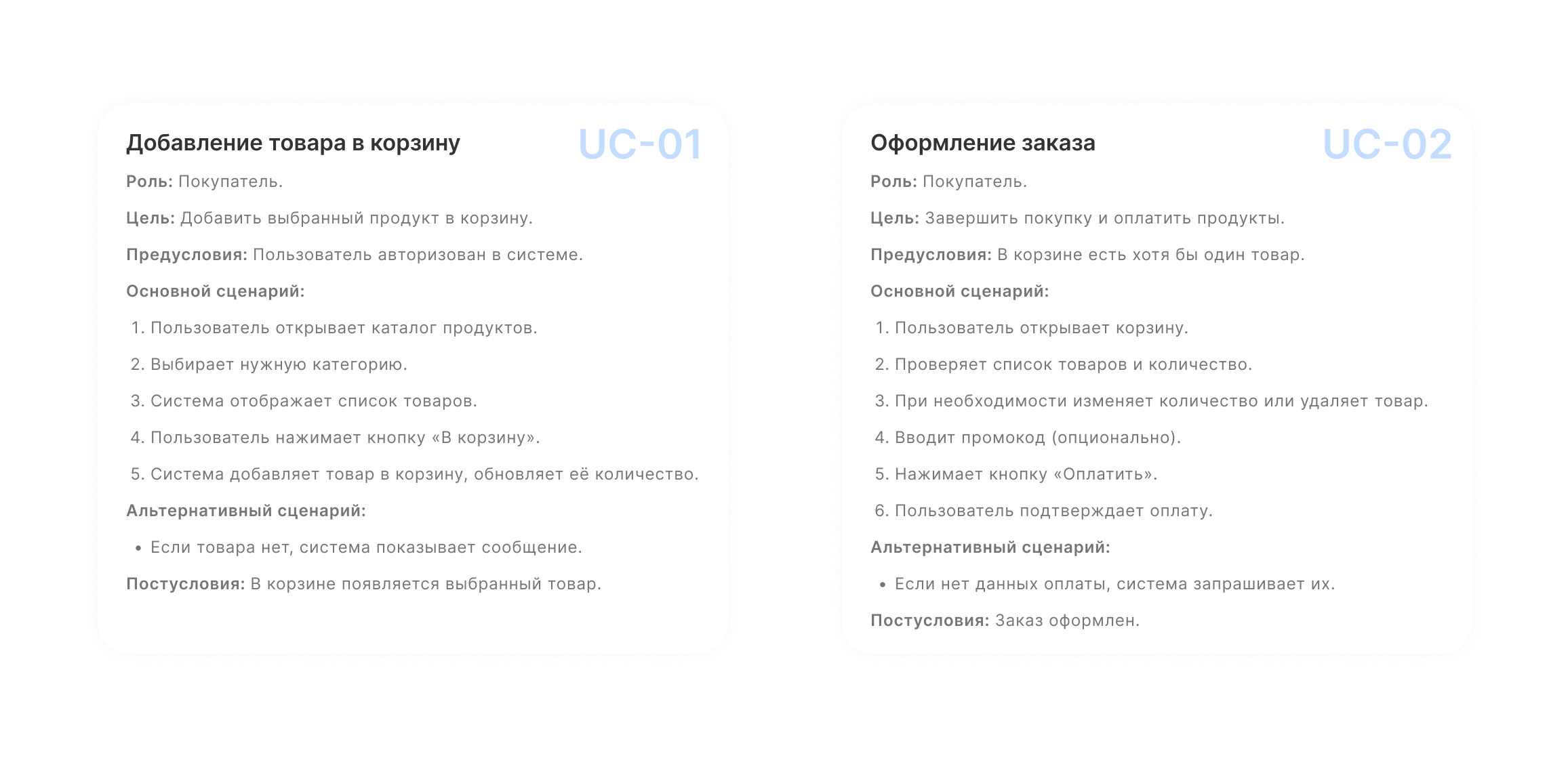 Это детальное описание того, как пользователь взаимодействует с продуктом в реальных условиях. Такой подход позволяет заранее проверить логику и удобство приложения, прежде чем перейти к разработке и тестированию.